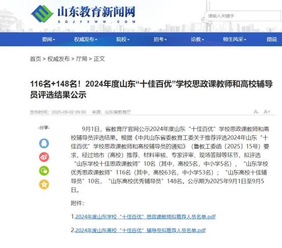 此次评选经地市(高校)推荐、材料审核、专家评审、现场答辩等环节。最终,评选出“山东学校十佳思政课教师”10名、“山东学校优秀思政课教师”116名以及“山东高校十佳辅导员”10名、“山东高校优秀辅导员”148名。